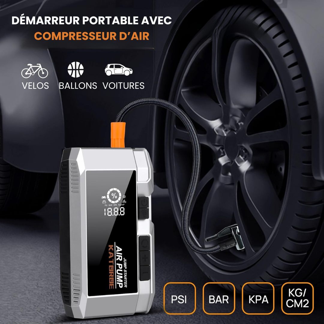 ✔️ 4-en-1 pratique : démarreur, compresseur, power bank et lampe LED.